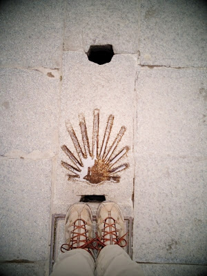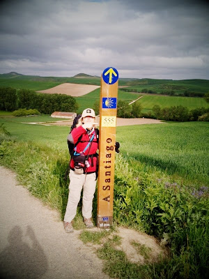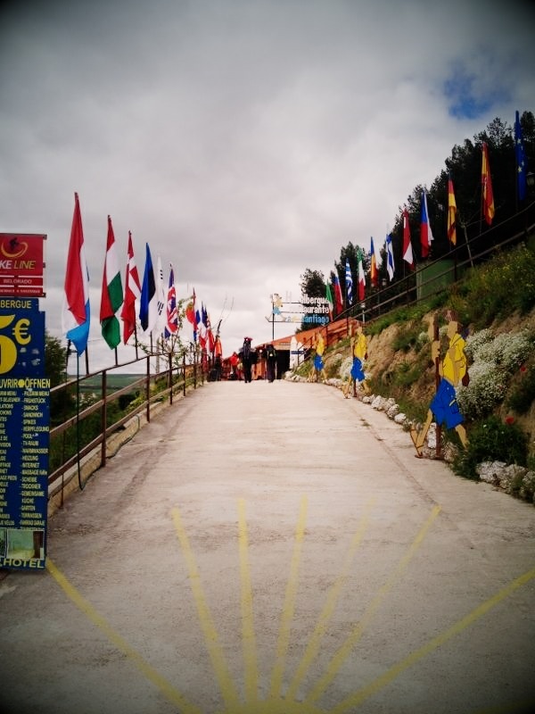 Un cippo chilometrico ci indica che mancano 555 km a Santiago di Compostela. La foto è di rito.