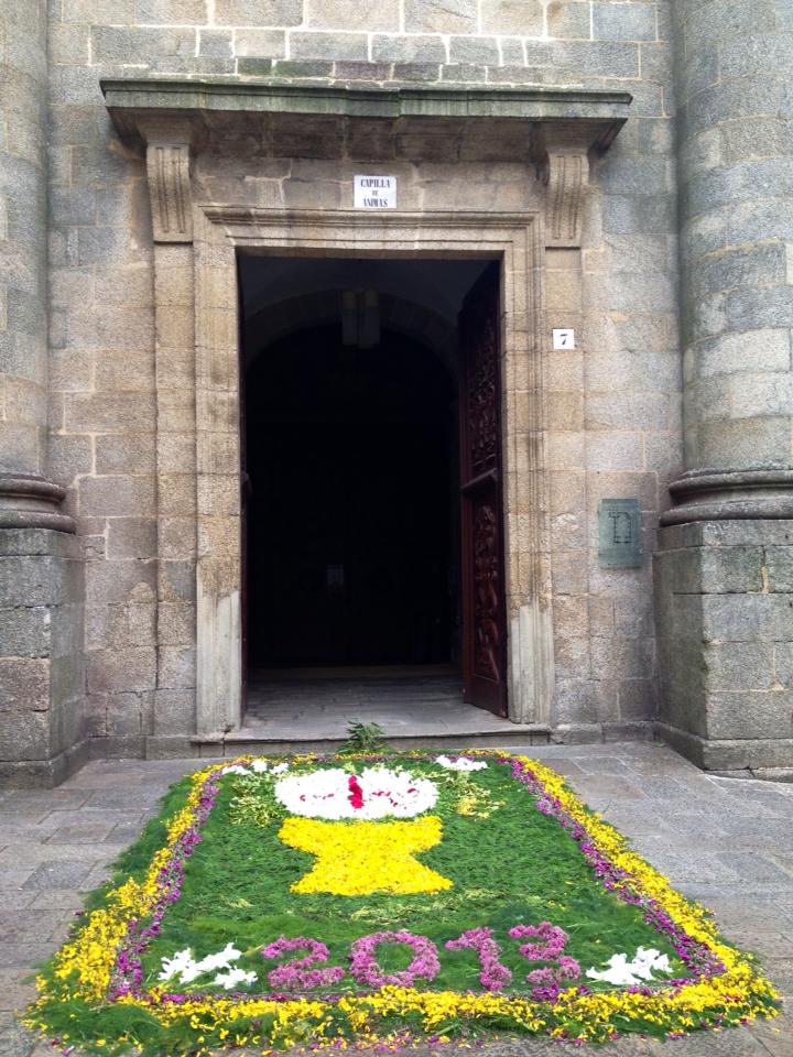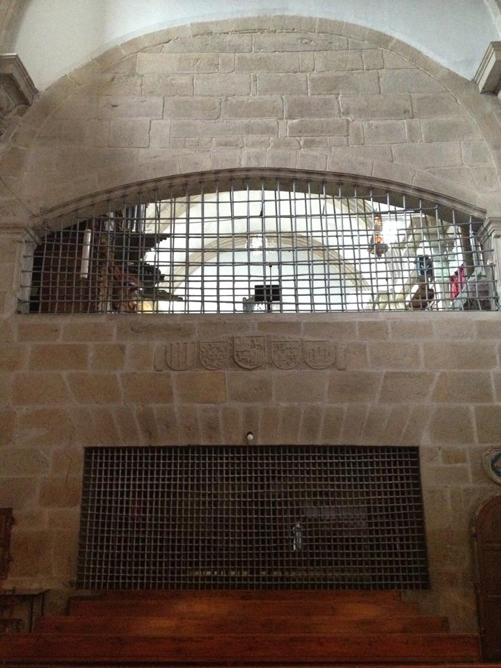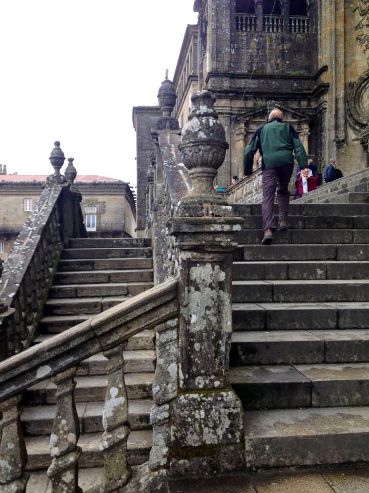 Then, the climb up the stairs, with aching legs, that brings us to the entrance door of the Cathedral. We are now able to view the famous Botafumeiro, the big censer that is skilfully oscillated by the tiraboleiros on the pilgrims attending.