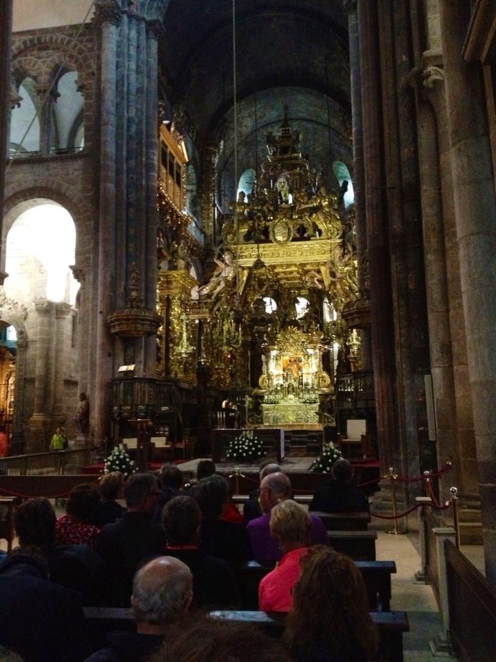 L’attesa di assistere alla celebrazione della messa mentre alla spicciolata arrivano, con la tipica andatura del pellegrino dolorante, tutti coloro che oggi hanno ricevuto la Compostela.