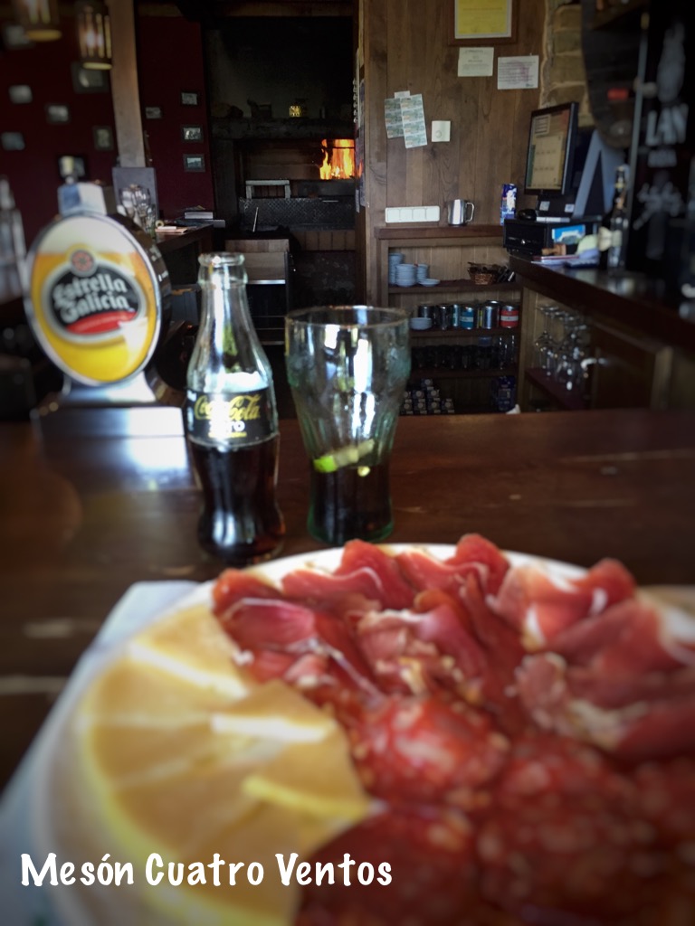Considerata la lunghezza della tappa di oggi, abbiamo deciso di fare soste regolari, ad ogni 7 chilometri circa. Una di queste, è stata molto piacevole, in un bel ristorante famoso per le sue grigliate, il “Mesón Catro Ventos”. Purtroppo era troppo presto per la grigliata ed abbiamo dovuto ripiegare su un meraviglioso piatto di affettati e formaggi locali, accompagnato da un pane freschissimo e croccante. Tutto sommato, non è stato un problema!