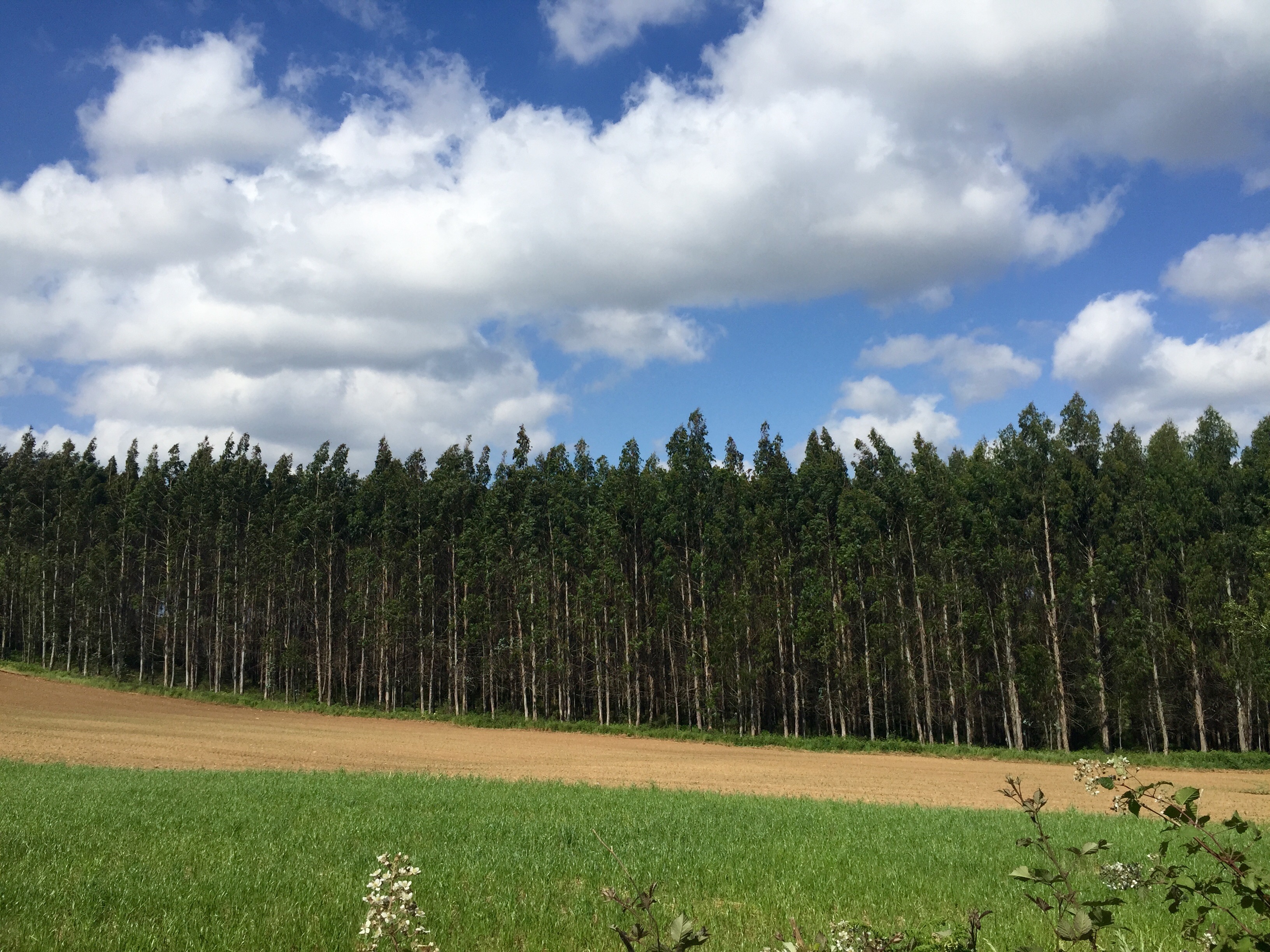 Anche oggi, dolce saliscendi continuo, tra boschi di stupendi eucalipti che col forte vento emanavano un aroma inebriante. Occasionalmente, qualche quercia sembrava volesse fare capolino, quasi a sottolineare che quella era terra dei maestosi eucalipti.
