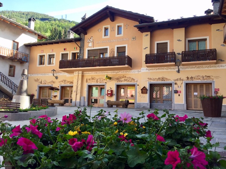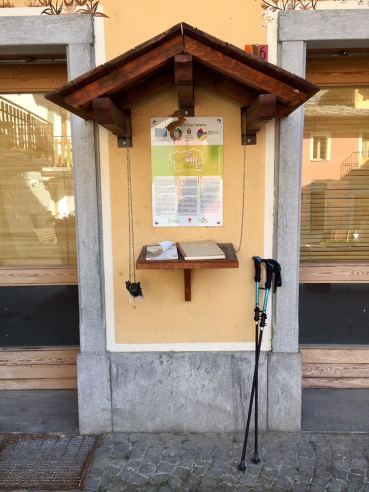 Appena partiti, ci siamo diretti verso le Poste nel centro di Etroubles dove è a disposizione dei pellegrini, all’esterno, su una bacheca, il timbro e un libro su cui scrivere il proprio nome.