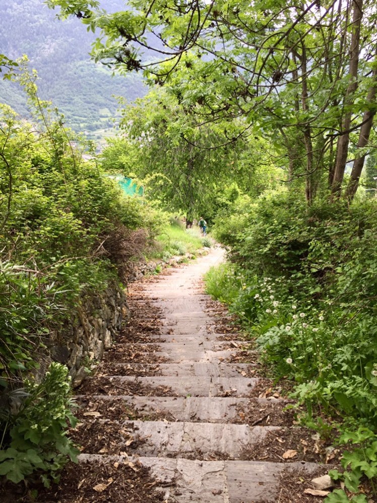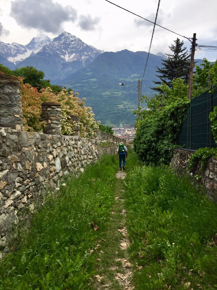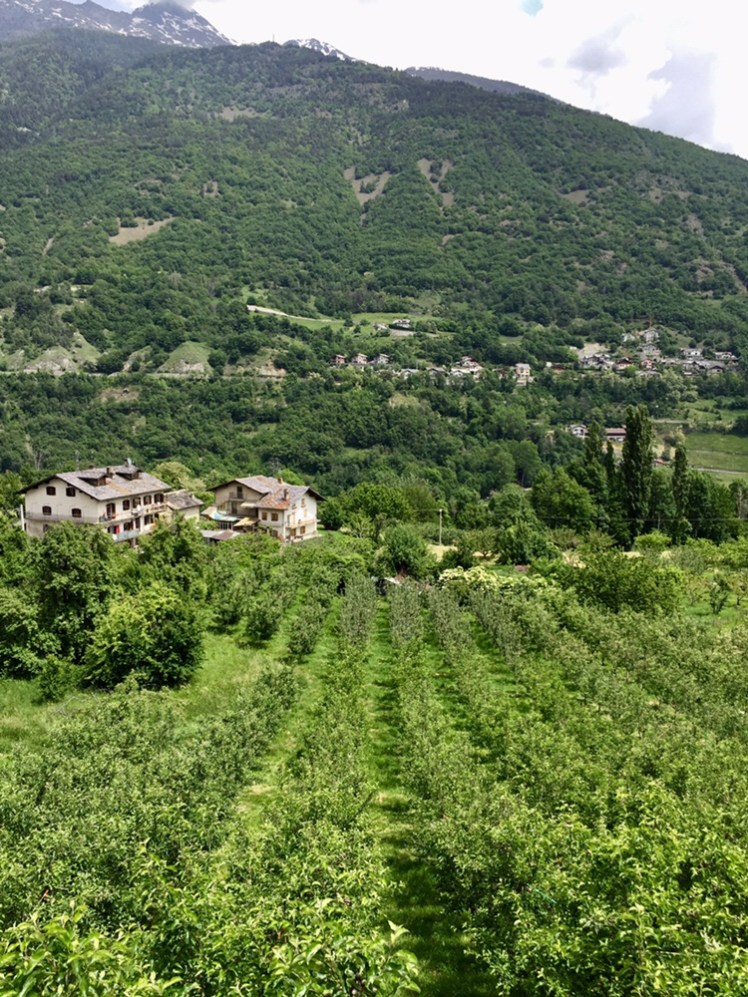 a circa metà tappa, si inizia la discesa verso Aosta, spesso ripida e sassosa. Si attraversano piccoli paesi e aree coltivate a frutteti e grandi orti.