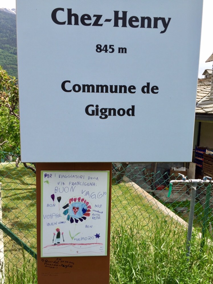 A Chez-Henry, all’ingresso in paese ci da il benvenuto un cartello scritto e disegnato da un bambino: