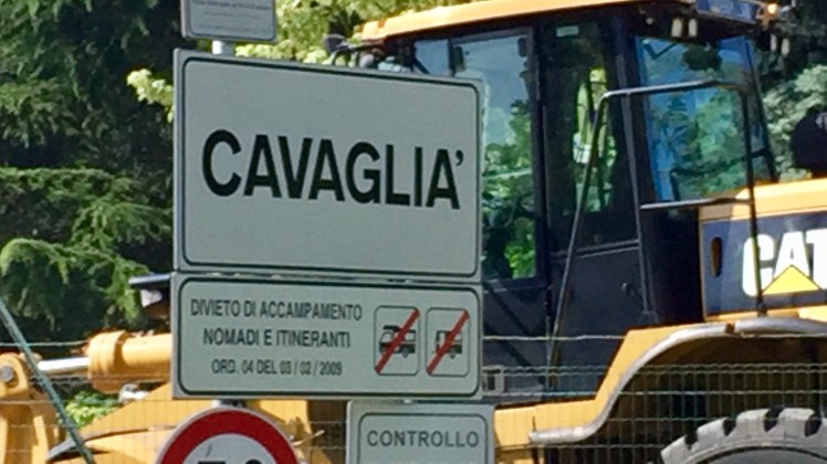 Dopo pochi chilometri sulla strada statale, entriamo a Cavaglià e mi colpisce il cartello che avvisa dell’inizio della cittadina. Il cartello avverte che dal 2009 un’ordinanza comunale vieta l’ingresso a nomadi e itineranti.