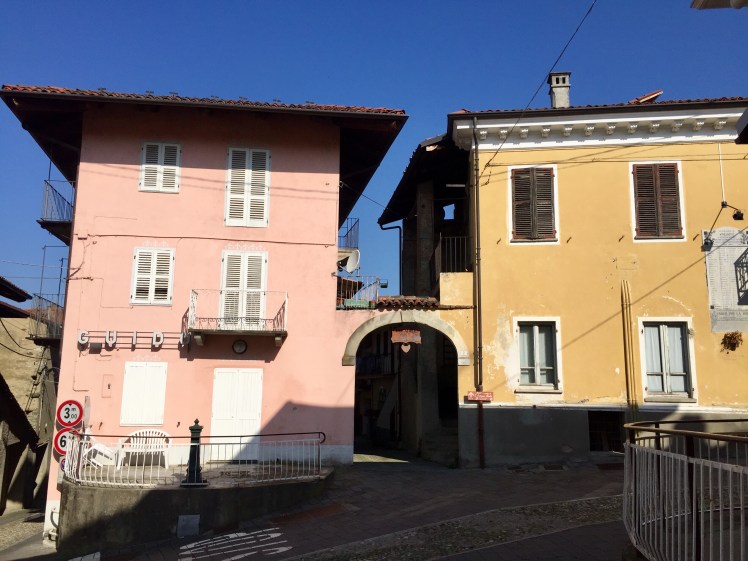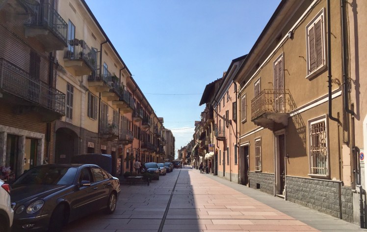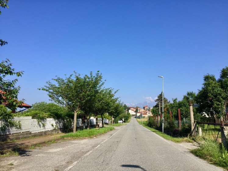 Ci immergiamo subito nella campagna tra campi coltivati e contadini indaffarati. Alle nostre spalle riusciamo ancora a intravedere le alte cime innevate della Val d’Aosta.