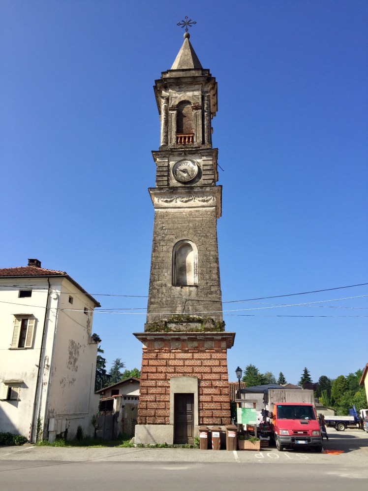 Entriamo a Roppolo. Sonnolento paesino di pianura, in cui svetta solitaria la torre campanaria di origini medievali, ma rifatta dell’800. Tristemente noto che ha alla sua base diversi contenitori della spazzatura, particolare che denota l’indifferenza dell’amministrazione pubblica verso l’arte. Decido di consolarmi con un caffè nel vicino bar.