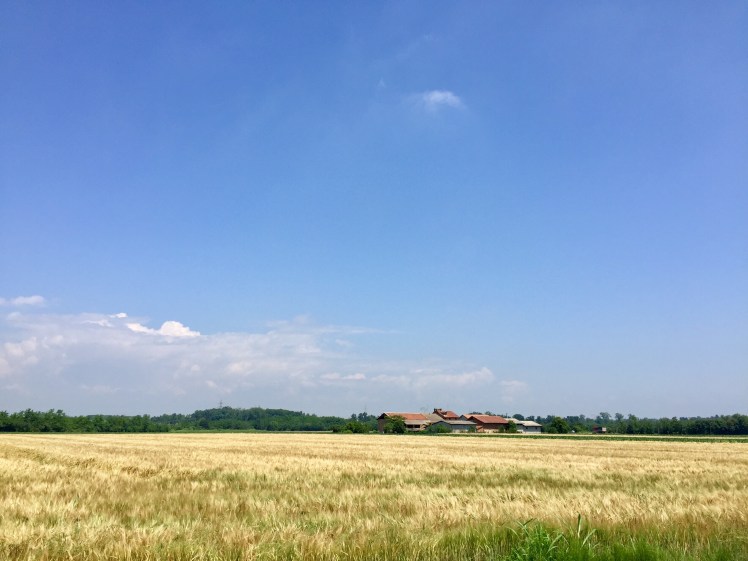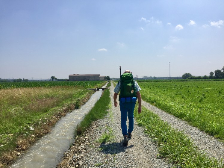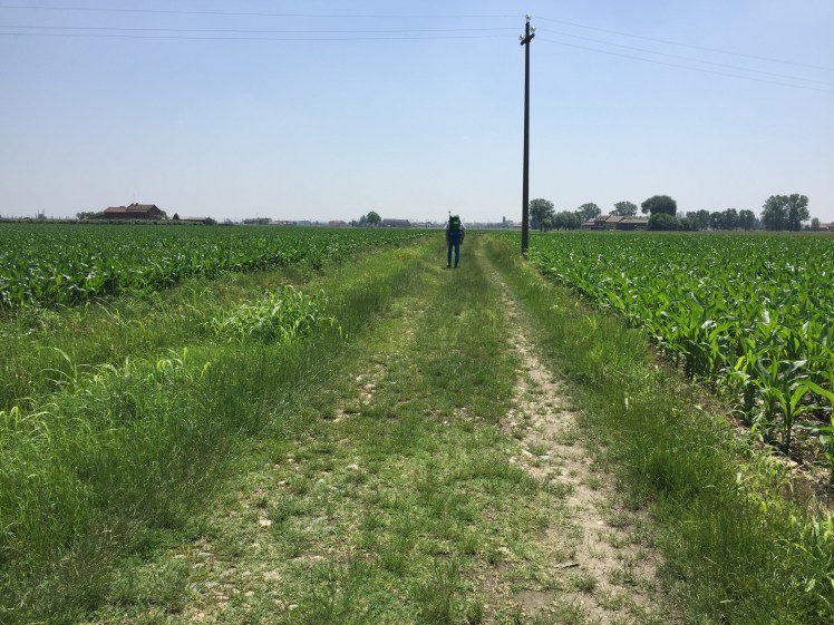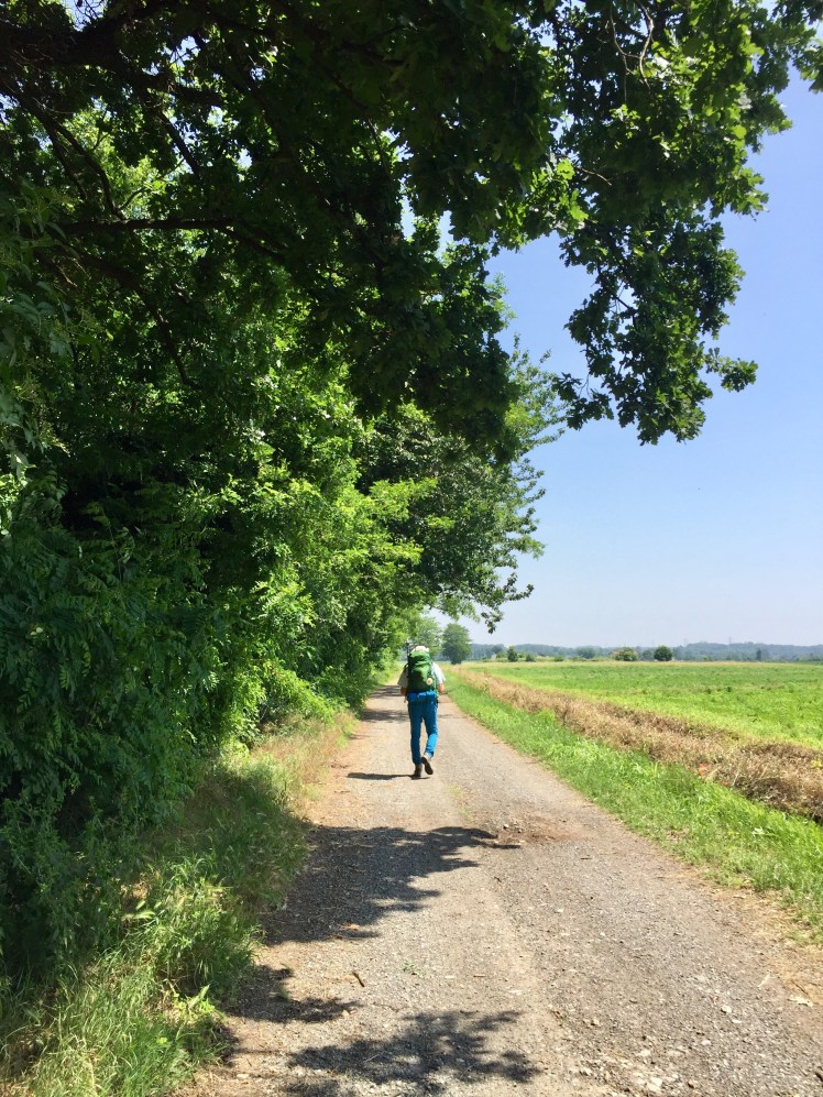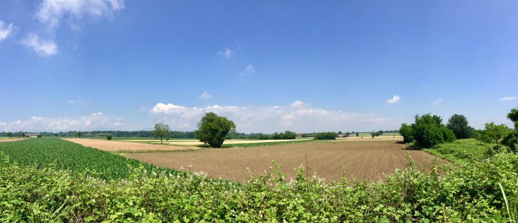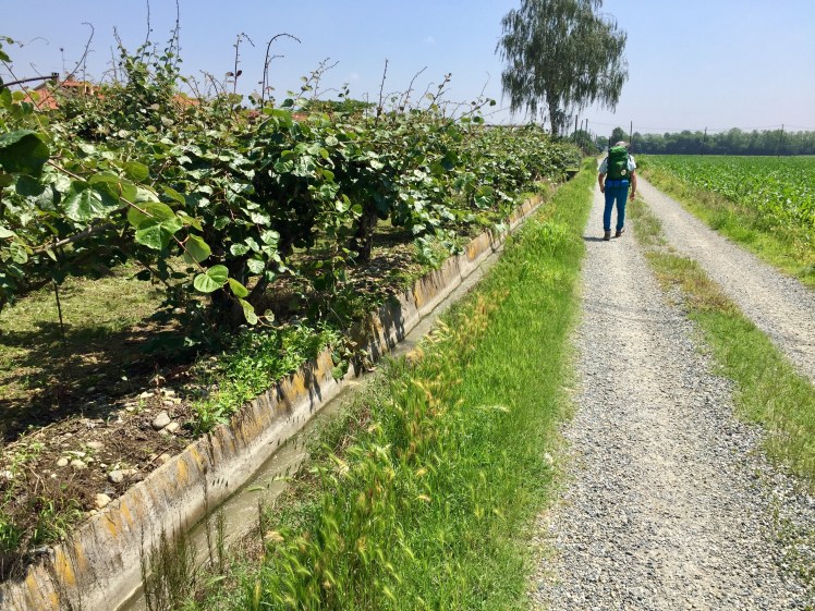All’orizzonte le montagne son svanite, l’estensione della pianura è inframezzata solo da pioppi e robinie che separano le varie proprietà. Tanti i contadini che lavorano coi loro macchinari. Rari i passanti, sempre divertiti nel vederci e simpatici nell’augurarci un buon cammino e spesso offrirci le loro ciliegie raccolte al momento per noi. I ciliegi, alberi generosissimi coi passanti. I loro rami ricchissimi di ciliegie penzolano tentatori sulla via, rallegrando chi vi passa sotto e che può fare una ricca merenda.