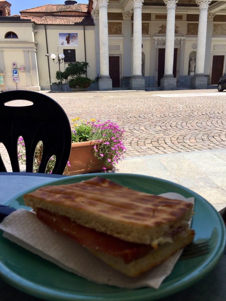 Sulla carrareccia assolata percorriamo gli ultimi chilometri. Arriviamo a Santhià in anticipo per il check-in in albergo, decidiamo allora di fare uno spuntino al bar sulla piazza centrale e goderci un meritato riposo al fresco.