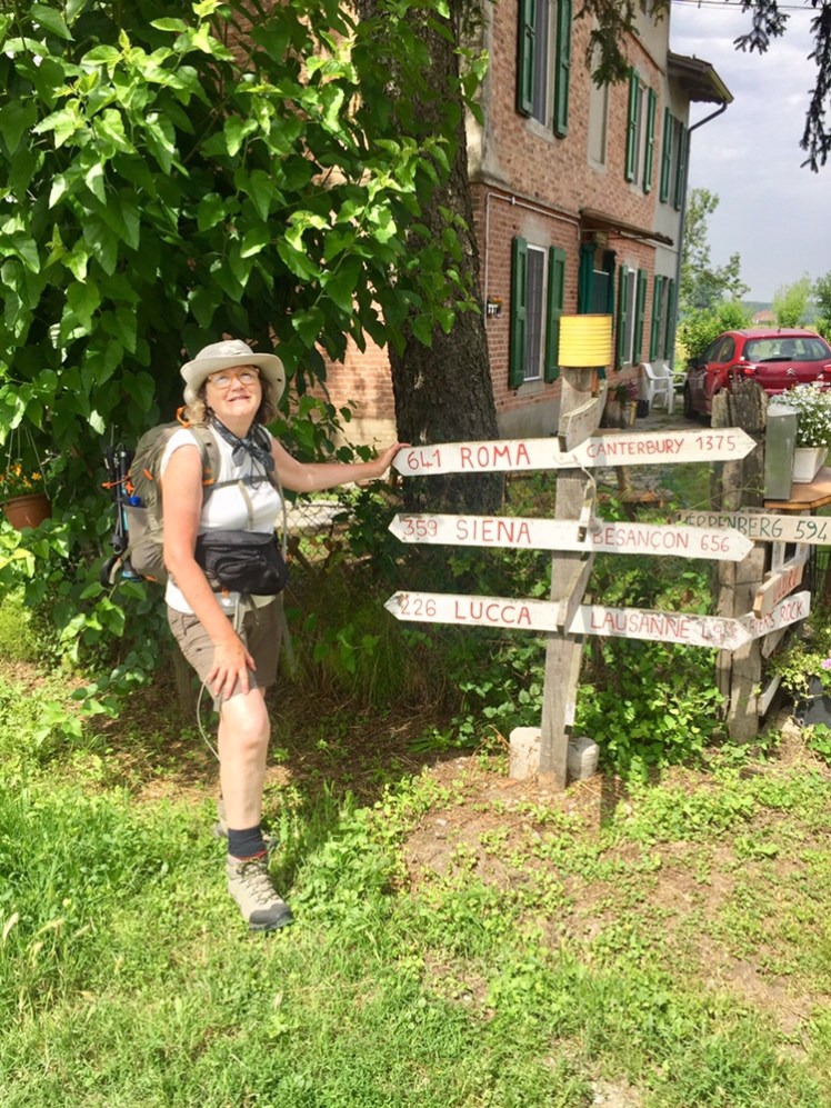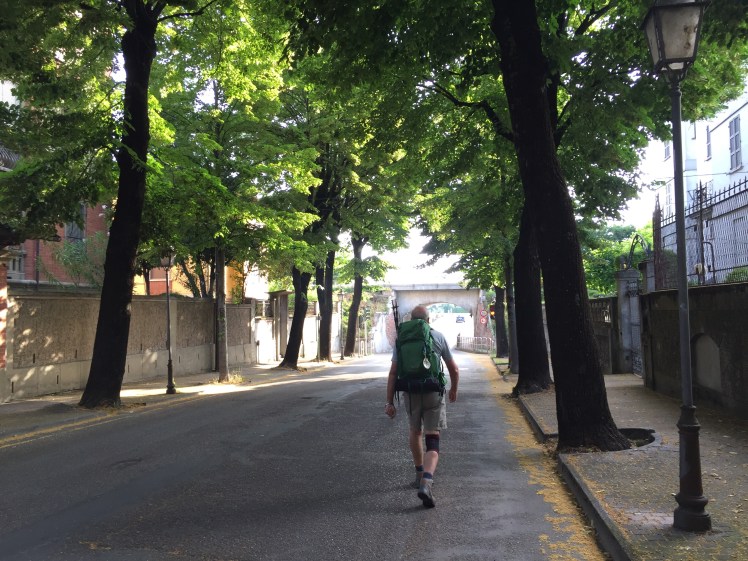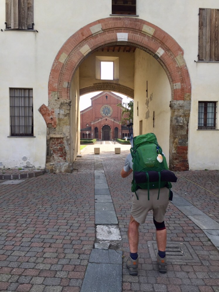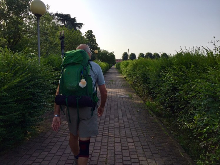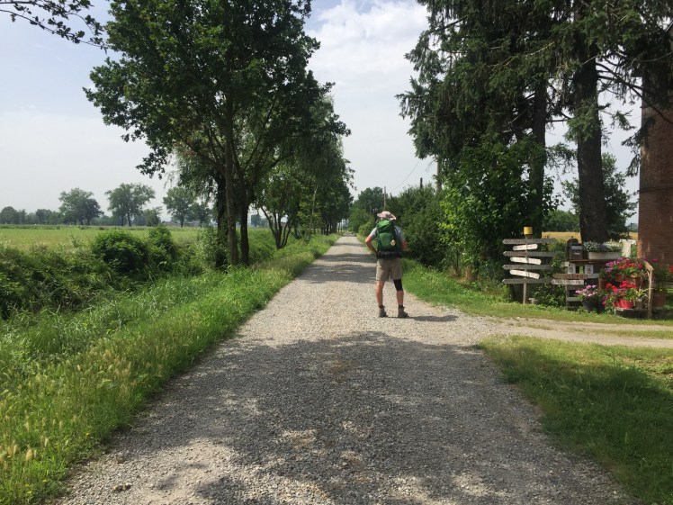 Mentre gustiamo il panino, entrano distrutti dalla fatica, accaldati e completamente sudati i due pellegrini che avevamo incontrato a Orio Litta, quelli che ho soprannominato “ticchettanti” perché quando arrivano, prima di vederli, si sentono i loro bastoncini ticchettare sull’asfalto. Ormai siamo diventati amici, li incontriamo spesso, qua o là sul cammino. Loro però si fermeranno a Massa, non arriveranno a Roma.