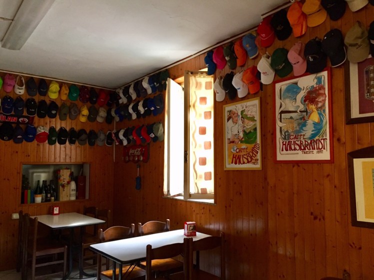 Rimango divertita dalla collezione di berretti appesi alle pareti del bar: