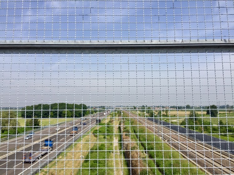 Attraversiamo, su un cavalcavia ben protetto da alte reti, l’autostrada del Sole e la ferrovia ad alta velocità su cui sfrecciano alternativamente i treni di Italo e di Trenitalia.