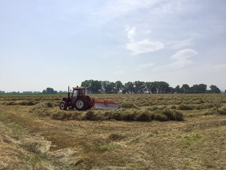 Poco più in là, approfittiamo della grande ombra di una quercia per far riposare le spalle dal peso della zaino e bere, mentre vicino a noi diversi macchinari stanno rigirando l’erba medica precedentemente tagliata e lasciata seccare al sole. Su uno di questi, noto alla guida un ragazzino che, evidentemente, durante le vacanze scolastiche, aiuta il papà che è su un altro macchinario poco distante da lui, nel lavoro dei campi.