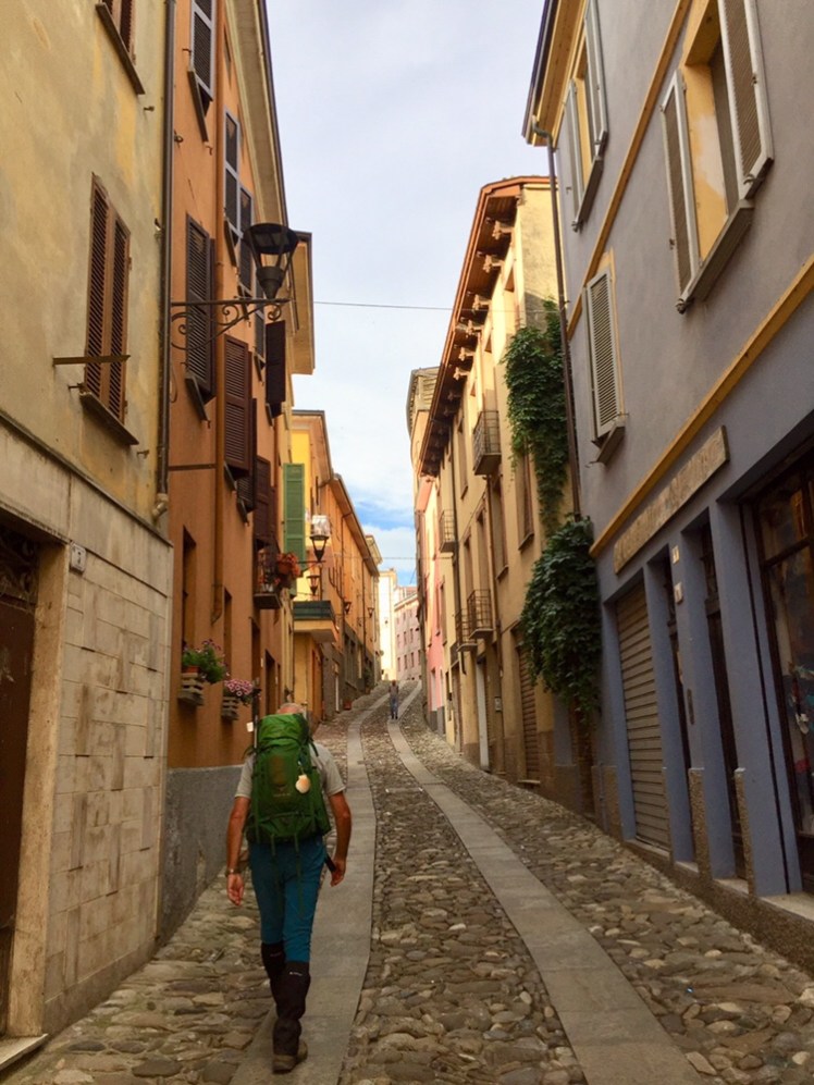 Appena passato il Duomo, inizia la ripida salita tra belle villette circondate da siepi e giardini ben curati. Molte di queste villette sono dell’inizio del ‘900, alcune in stile liberty. Da qui in poi avremo 19 chilometri di salite fino a Cassio, fatta eccezione per un breve tratto in discesa.