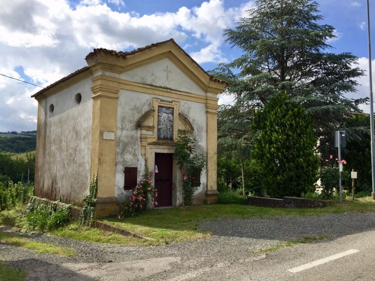 Lasciamo la casa della gentilissima Sara e ci dirigiamo verso la chiesa di Felegara. Dalle belle villette che si affacciano intorno a noi, un concerto di latrati di cani di tutte le razze, uno in particolare, di taglia enorme, ringhia e cerca di scavalcare il cancello. Non è stata un’esperienza piacevole!