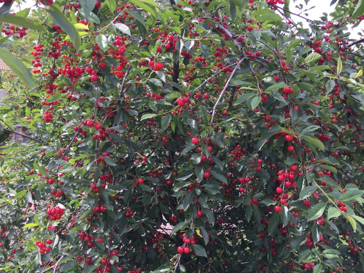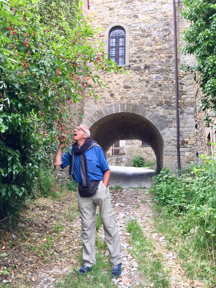 Poco più in là, un signore anziano sta cogliendo le amarene dal bell’albero che ha nel giardino di casa e, al mio passaggio, me ne offre quante ne voglio, io, felice, accetto e ne faccio una scorpacciata.