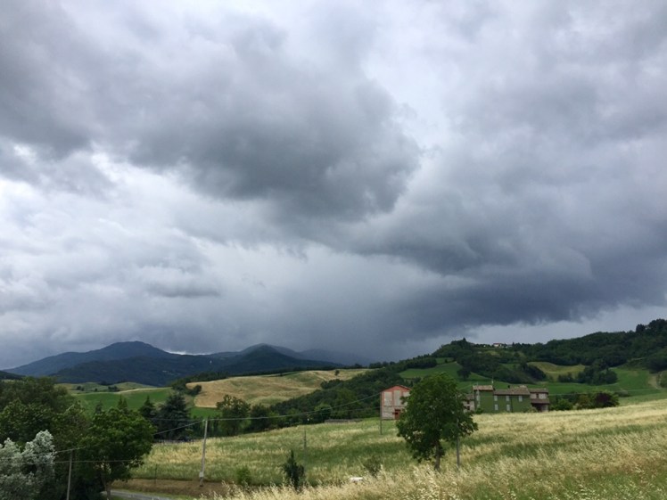 Entriamo nel bosco dove dovremmo rimanere per diversi chilometri, ma i tuoni e i fulmini ci fanno cambiare itinerario. All’altezza di Case Storti, usciamo dal bosco e percorriamo la statale della Cisa, molto più sicura in caso di fulmini. La statale è molto ben tenuta, con banchine sicure per i pedoni.
