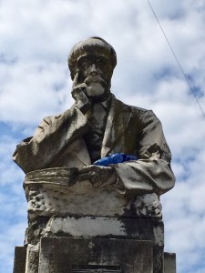 Arrivati ad Avenza, troviamo una statua perplessa di Giuseppe Mazzini con un intruso tra le sue braccia: