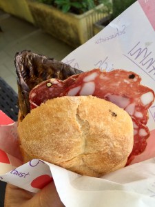 Accaldati e depressi, decidiamo di fermarci per un panino in una trattoria nascosta tra una fabbrica e l’altra. Era vuota quando siamo entrati, ma nel giro di cinque minuti si è riempita di operai che evidentemente avevano appena iniziato la pausa pranzo. Siamo rimasti lì, all’ombra di un grande platano, per una mezz’oretta, a goderci il panino e un gelato.