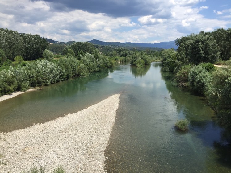 È una tappa estenuante per la pericolosità, per il caldo e per la monotonia. Ciliegina sulla torta è stata la parte finale che si svolge per cinque faticosissimi chilometri su una pista ciclabile sull’area golenale del fiume Serchio. È un’area deserta, monotona e la pista è bianca, un colore che con la canicola diventa una tortura per gli occhi.