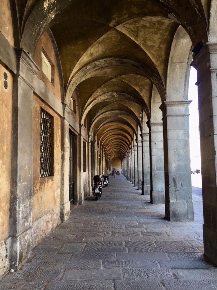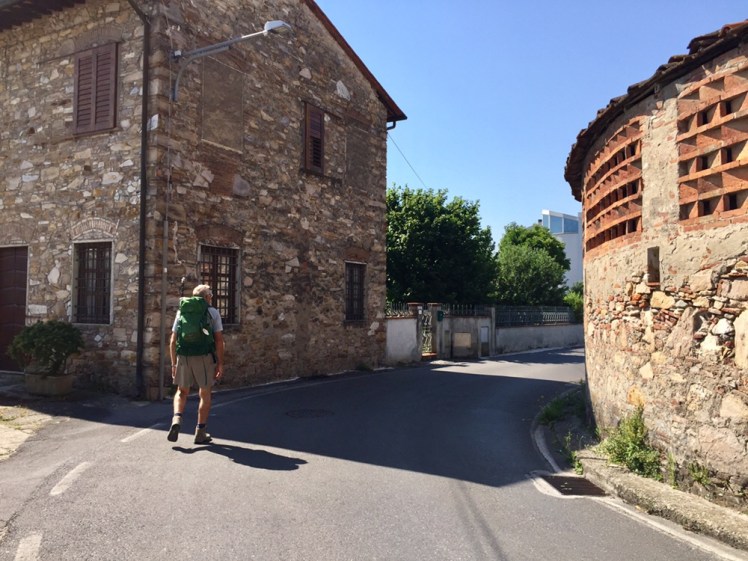 Dopo un lungo tratto su una strada provinciale trafficata, ma sempre con banchina libera da erbacce, arriviamo in sicurezza a Porcari. Sin dall’inizio del paese, c’è un comodo marciapiede e preziose panchine per riposare, forse più utili in inverno o dopo il tramonto perché a quest’ora e in questa stagione, essendo in metallo, sono roventi.