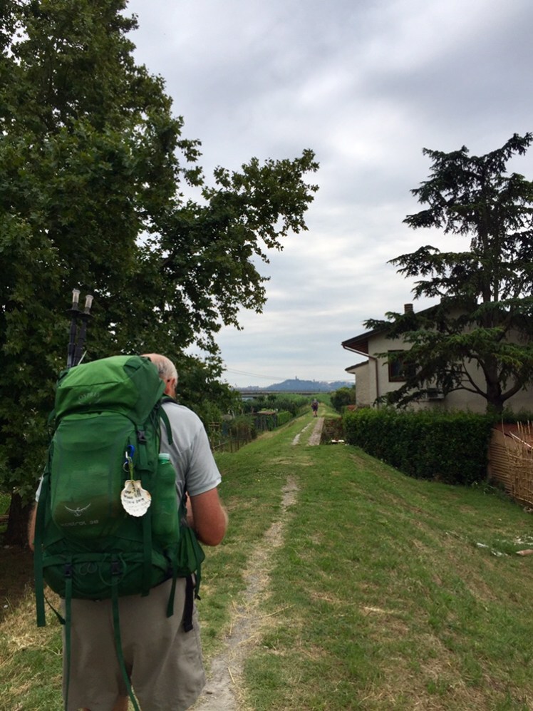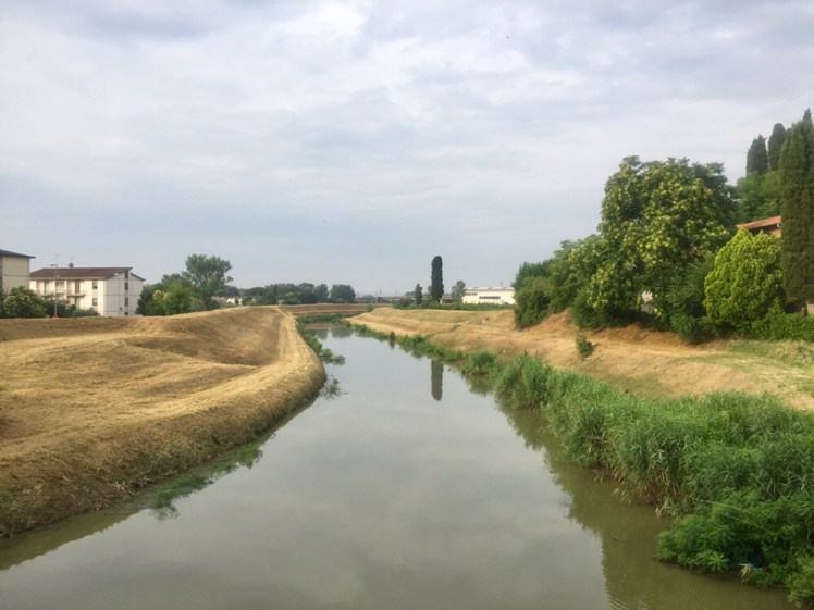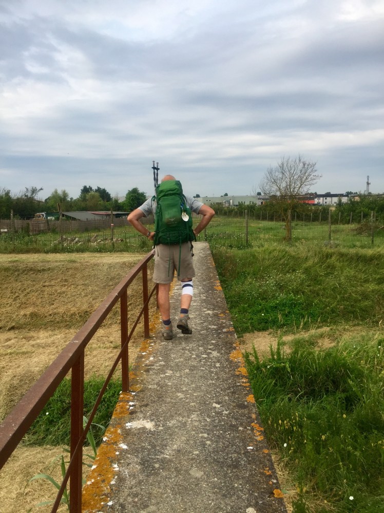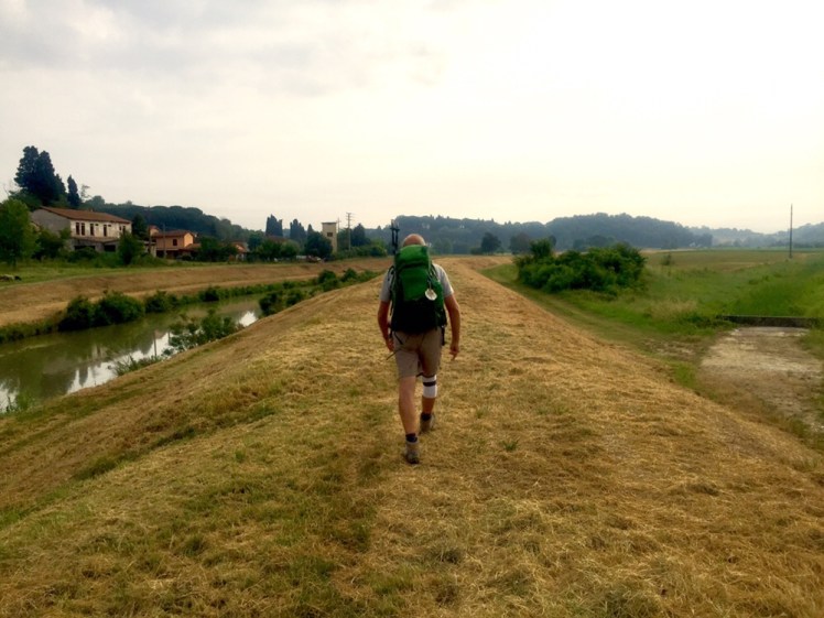 Ormai nella periferia di Fucecchio, ma sempre sull’alzaia, sentiamo una voce alla nostra sinistra che ci incita e sorridendo ci fa notare che senza il sole si cammina meglio. Mi giro verso la voce e vedo un simpatico signore a torso nudo che sta zappando il suo orto. Gli rispondo che anche il lavoro è meno faticoso se non c’è il sole, lui ride e mi augura un buon cammino.