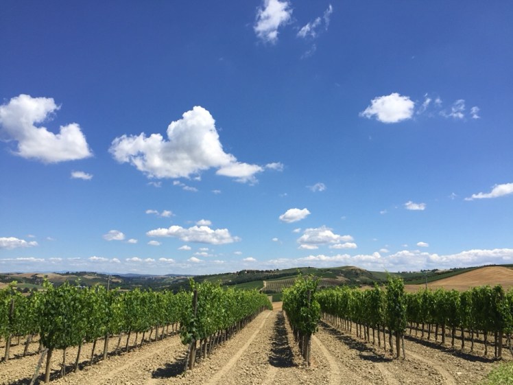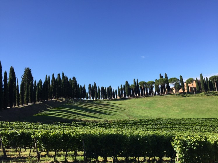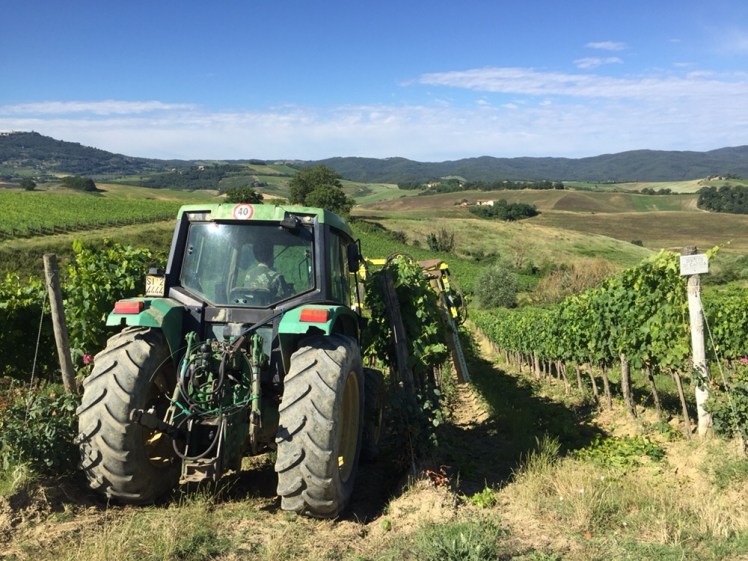 Qualche giorno fa, durante una mia chiacchierata con la proprietaria del capannone che ci ha dato ricovero dal temporale poco prima di Monteriggioni, ho imparato che in questa stagione la vite va cimata nella parte terminale dei tralci e dalle femminelle. Operazione che dà più vigore alla vite e che crea un’uva migliore. Una volta, si faceva a mano ed era un lavoro impegnativo e lunghissimo che richiedeva tanta mano d’opera. Oggi è un lavoro fatto velocemente con una macchina che con grande delicatezza è in grado di cimare la vite senza rovinare i giovani grappoli.