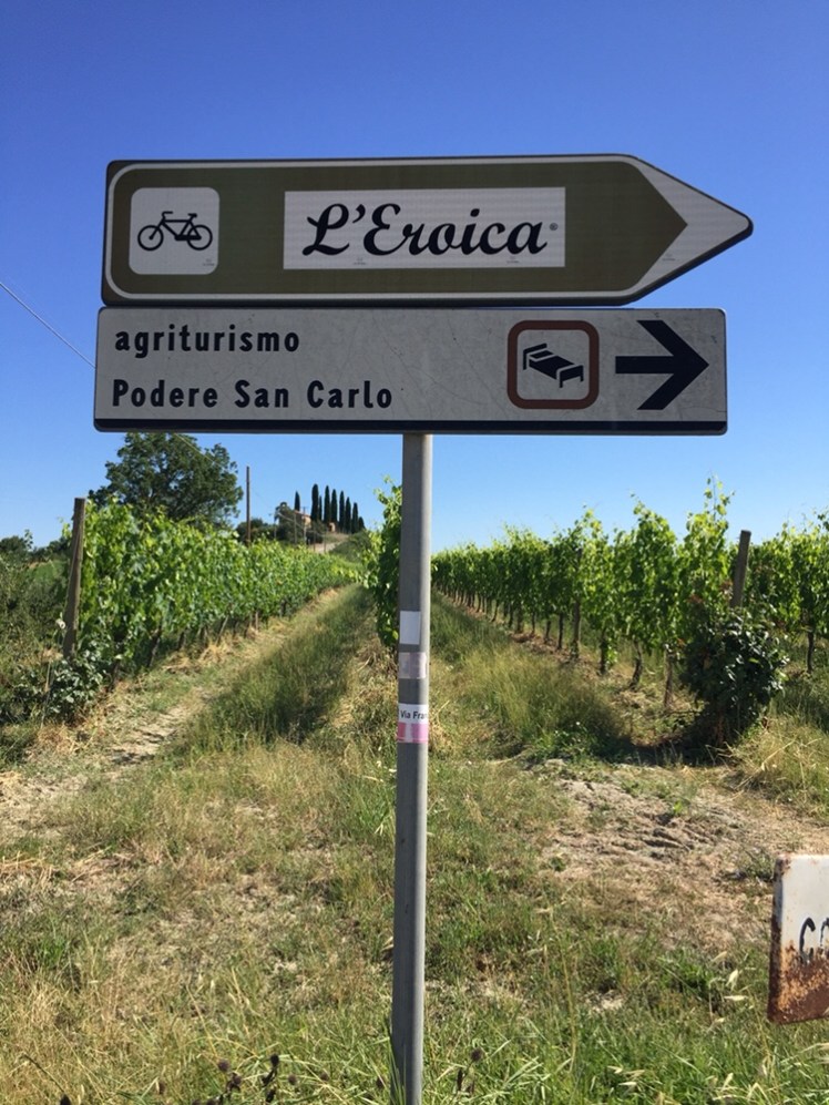 sino a superare il quartiere industriale. Da qui ci immettiamo su una strada bianca che coincide con la famosa “Eroica”, la gara ciclistica che si svolge ogni anno in questa zona del senese.