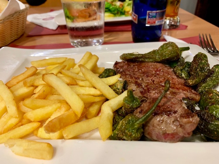 Ritornati in albergo, abbiamo subito cenato. Questa sera ho scelto il “Solomillo de ternera”, cioè una bistecca ai ferri con peperoni e patatine.