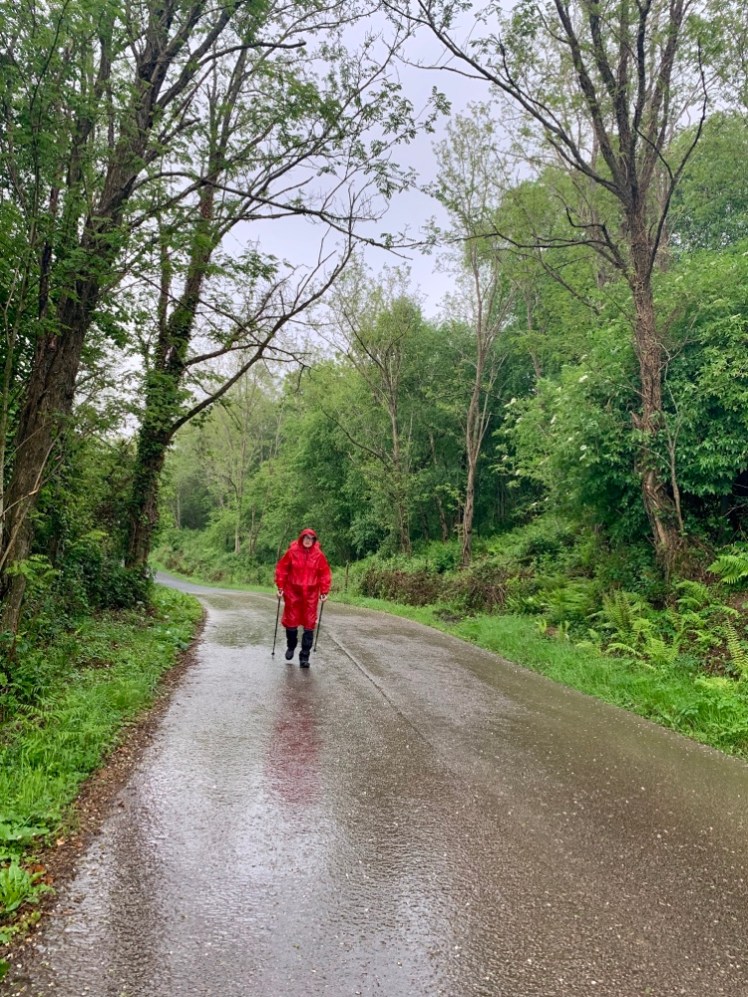 Appena fuori, notiamo che non piove, ma il cielo è minaccioso. Non è un problema, si cammina meglio e non si suda troppo. Il problema, e grande, potrebbe esserci solo se insieme alle nuvole ci fossero i fulmini (ne sono terrorizzata), ma oggi c’erano solo nuvole “amiche”. Almeno, per me lo sono, perché mi piace camminare sotto la pioggia.