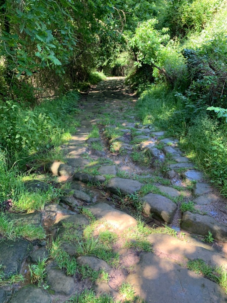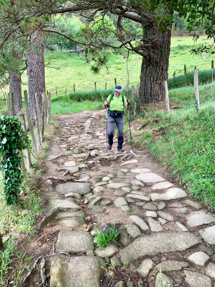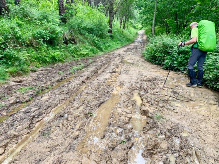 Dopo un altro breve tratto di asfalto, inizia un’altra tortura che forse è peggio del fango: la “calzada romana” bagnata, infangata e in ripida discesa, un vero tormento per ginocchia e caviglie.