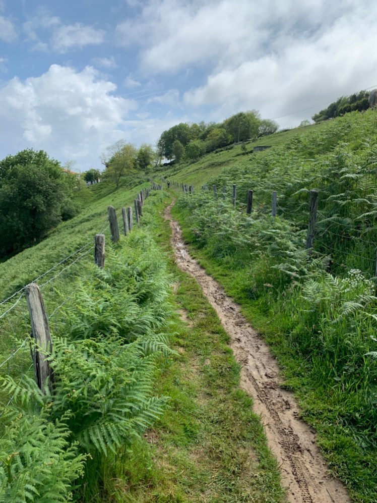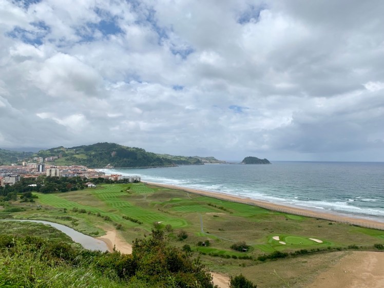 Ormai è iniziata la discesa verso la meta di oggi. Qui il panorama si apre sulla bella cittadina di Zarautz, la sua spiaggia sull’oceano e su un bel campo di golf.