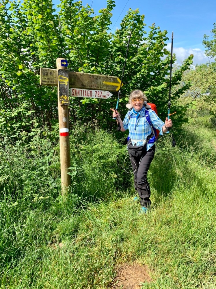 Prima di iniziare il tormento, ignara di cosa mi aspettasse, sorridevo contenta davanti al cartello “Santiago 787 km”.