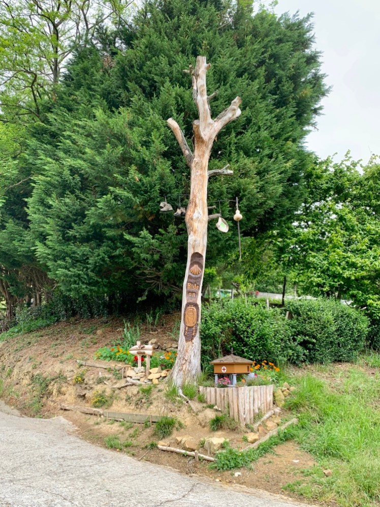 Incontriamo un albero inciso coi simboli del cammino con alla base una cassetta di pronto soccorso per i pellegrini. Noi ringraziamo, ma non ne abbiamo bisogno, fortunatamente!