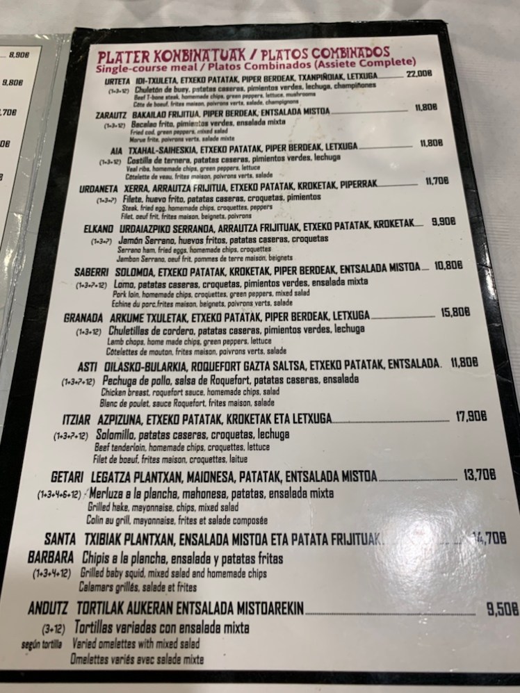 Dalla lettura del menu si capisce che nei Paesi Baschi non amano molto variare le verdure, perché i contorni son sempre gli stessi: patate, insalata, pomodori, peperoni. Ormai è da quando sono arrivata che ho sempre quel contorno.