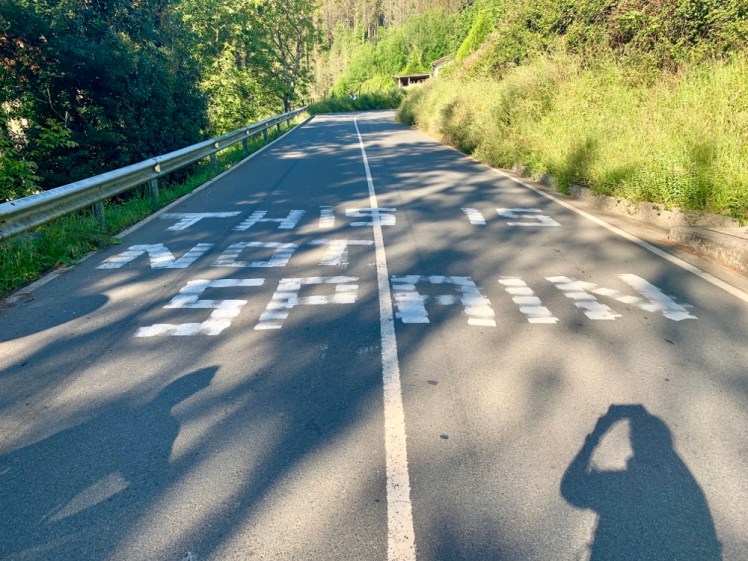 Poco dopo, ci colpisce questa grande scritta sull’asfalto: