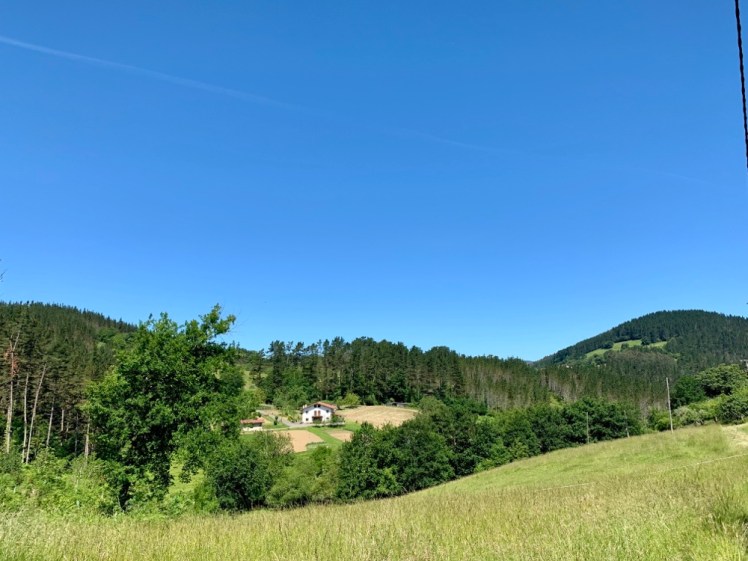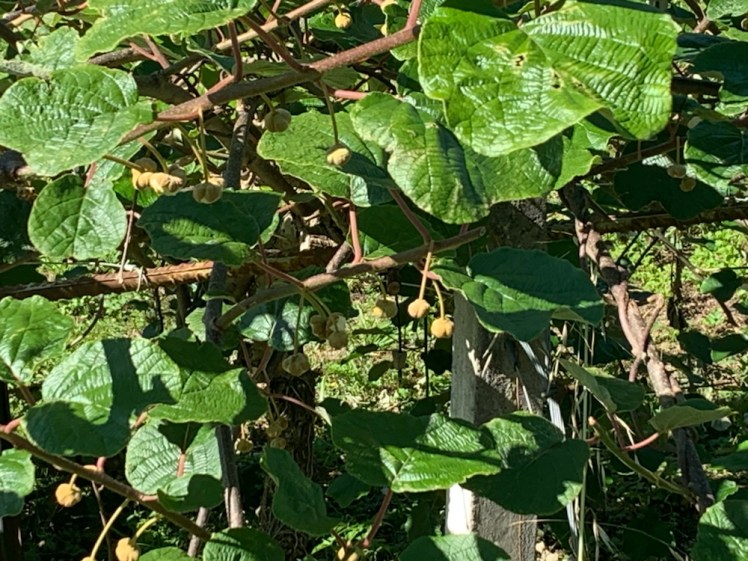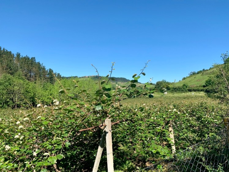 Con grande sorpresa, vicino al paese di Olabe, intravvedo una coltivazione a me famigliare, avendone viste parecchie sulla via Francigena. È di kiwi! Alcune alberi invadono, coi loro rami, la sede stradale e ho così la possibilità di toccarle e osservarle da vicino. Noto con piacere i piccoli frutti appena cresciuti e che saranno pronti in autunno per la raccolta.