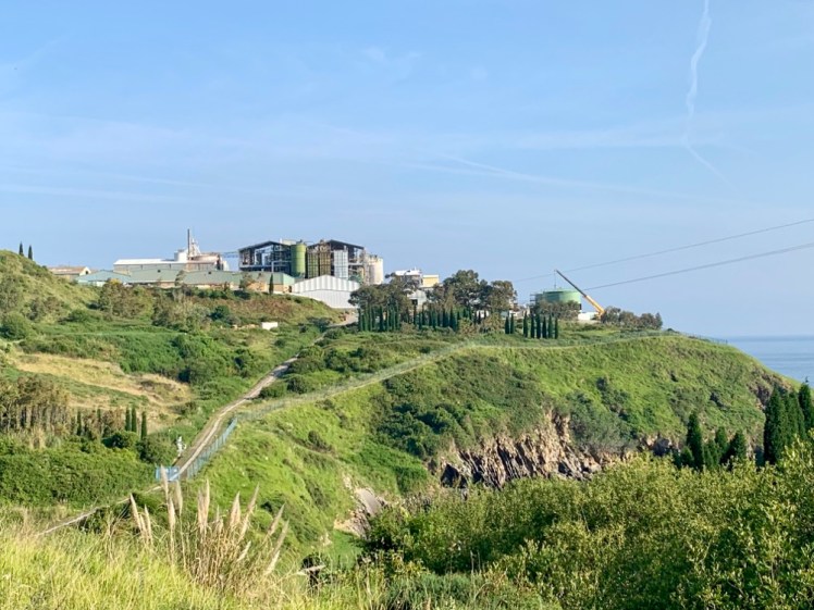 Sbuchiamo da un fianco della collina e davanti a noi si para un “mostro”. È un impianto chimico in cui viene utilizzato il fluoro. È proprio su un promontorio in bella vista sull’oceano. Il suo apparire lascia sbigottiti, anche perché, oltre ad imbruttire la scogliera, rilascia i suoi miasmi nell’aria.