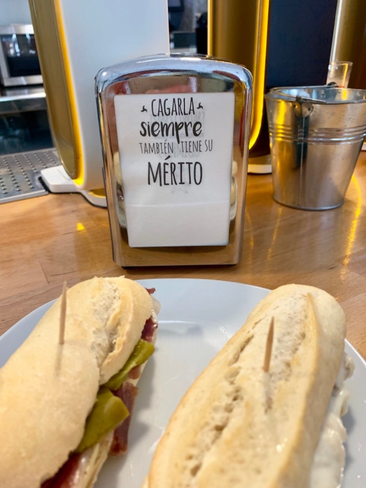 A Mioño facciamo finalmente una pausa nel primo bar che incontriamo. Il boccadillo è ormai un obbligo, accompagnato da un buon caffè. Mi accorgo, un po’ confusa, che i tovaglioli che devo usare per avvolgere il mio panino sono stati creati da qualcuno con un umorismo “da bagno”. Non nascondo di aver preferito non avvolgere il panino, ho però sorriso alla battuta.