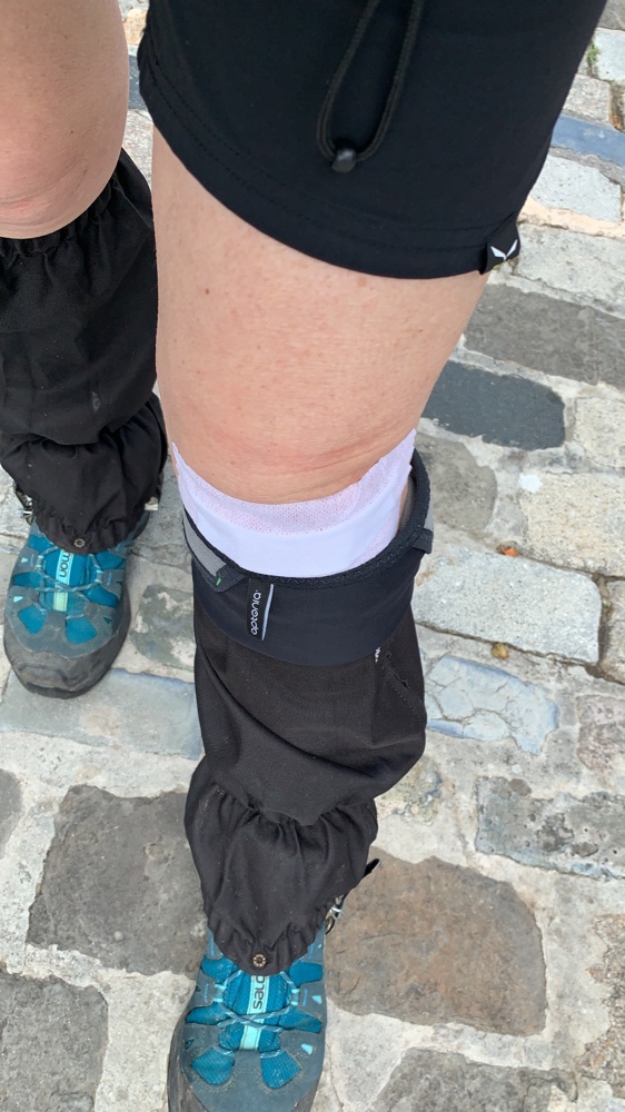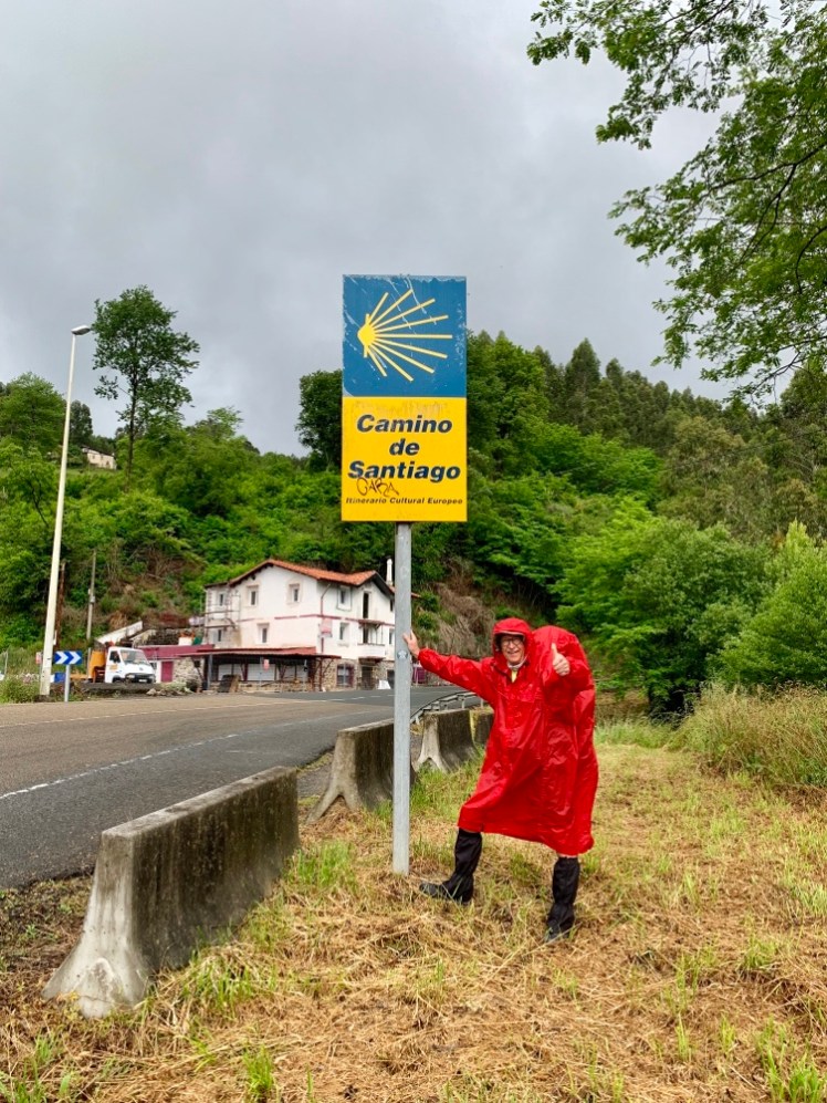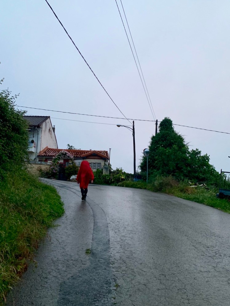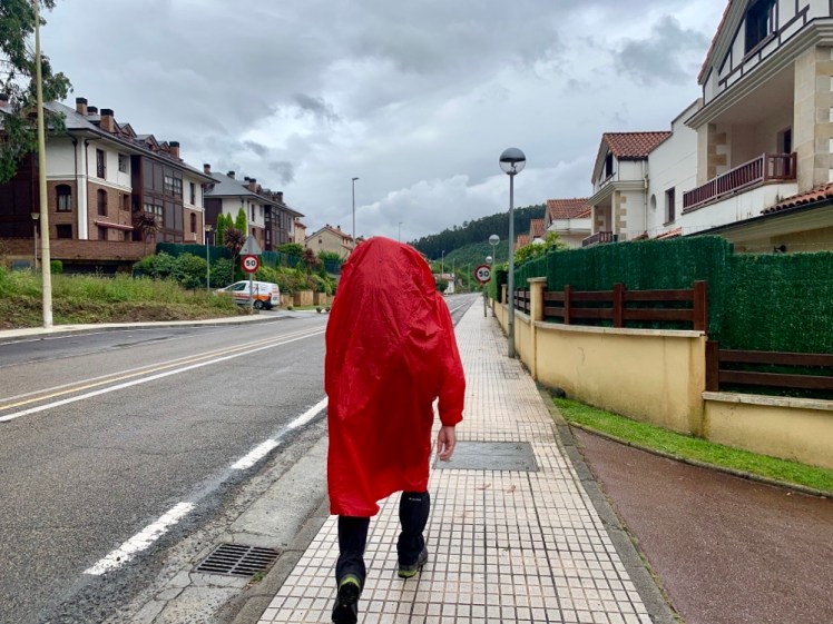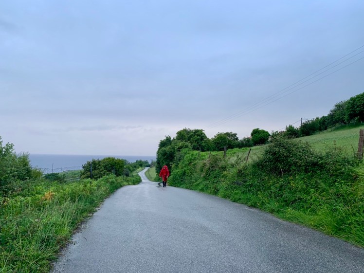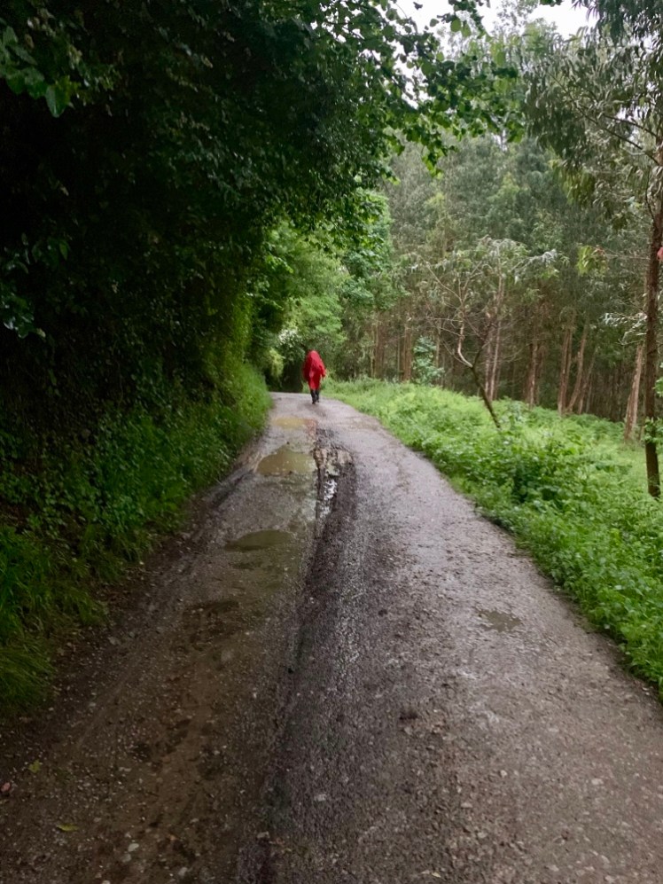 Piove. Ci infiliamo ghette e mantella, ma non usiamo i bastoncini perché la tappa si svolge su asfalto.