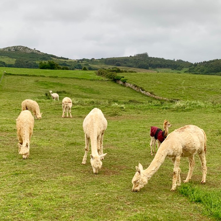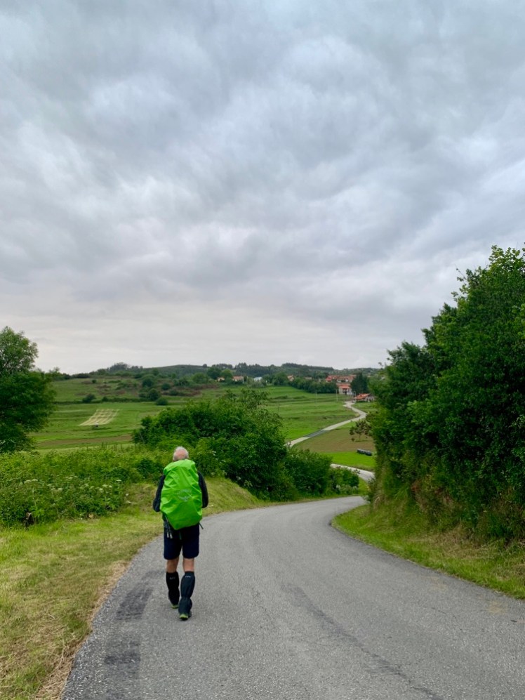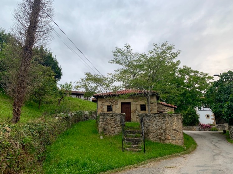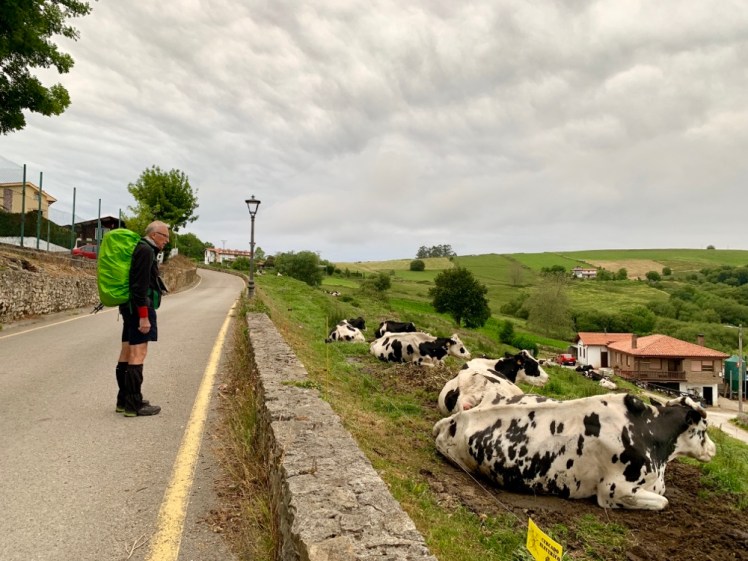 Subito fuori dal borgo, ci immettiamo su una strada che si inoltra nella campagna cantabrica, con bei pascoli e coltivazioni di mais. Ovunque, la campagna ondulata ha qua e là belle fattorie con mucche che, data l’ora antelucana, riposano e ruminano.