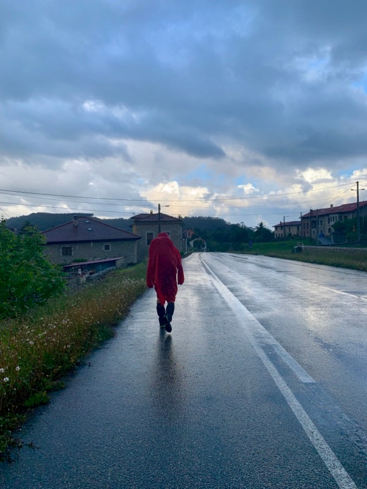La pioggia inizia a cadere ben presto e non ci lascerà più. Forti acquazzoni si abbattono improvvisi, costringendomi a tenere sempre l’ombrello attaccato alla cintura, in modo da aprirlo velocemente. Gianfranco indossa la mantella sempre, fino alla meta.