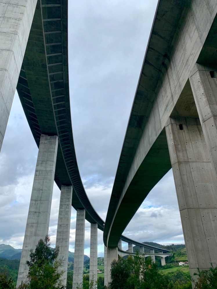 In una curva a gomito, passiamo sotto gli imponenti pilastri del viadotto dell’autostrada da cui proviene il rumore costante dei mezzi che la percorrono.