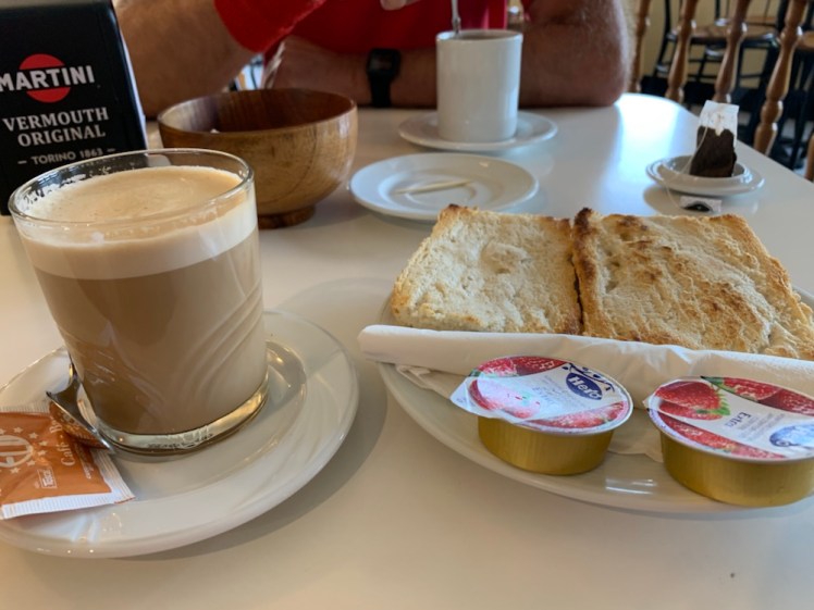 Con grande sollievo, vediamo apparire sulla sinistra un’area di servizio con bar. Facciamo colazione con croissant e “cafè con leche en vaso”. In Asturia, non solo la “ciuleta de ternera” ha dimensioni non umane, ma anche il croissant!