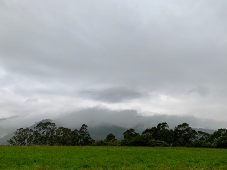 Le colline intorno a noi sono avvolte da un fitto strato di nebbia e la pioggerellina continua a cadere, dando al paesaggio un aspetto invernale.