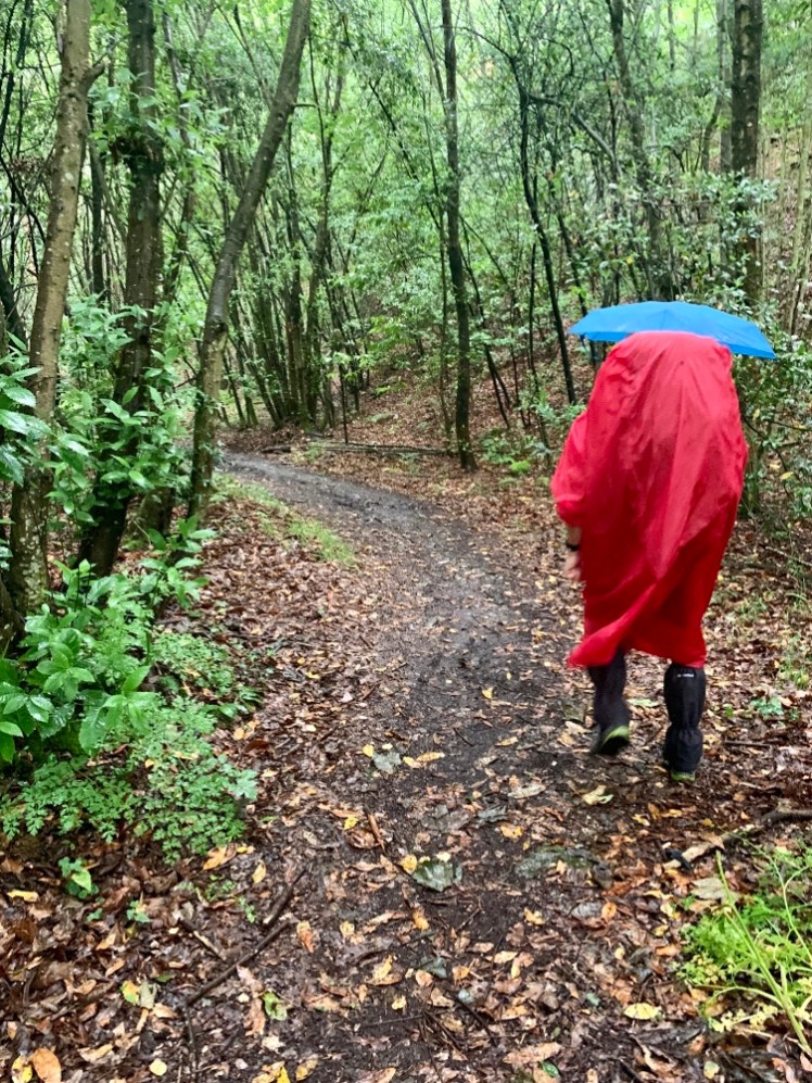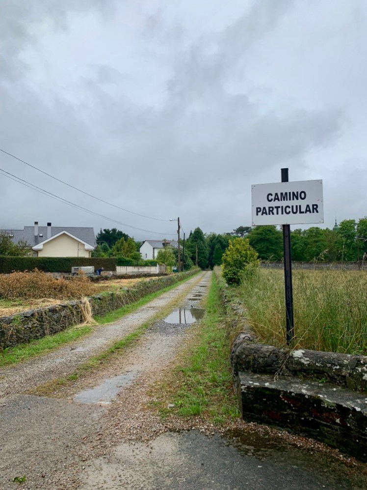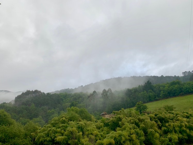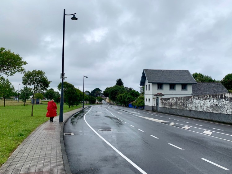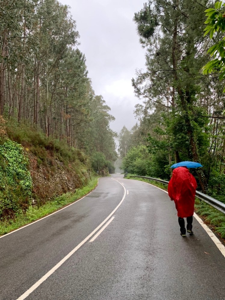 Incontriamo due pellegrini italiani completamente bagnati e sporchi di felci sulle maniche e sui pantaloni. Sono appena usciti dal sentiero nel bosco, molto fangoso e quasi chiuso dalla vegetazione. Han deciso di percorrere la N-632, più lunga, ma più sicura in giornate come questa.