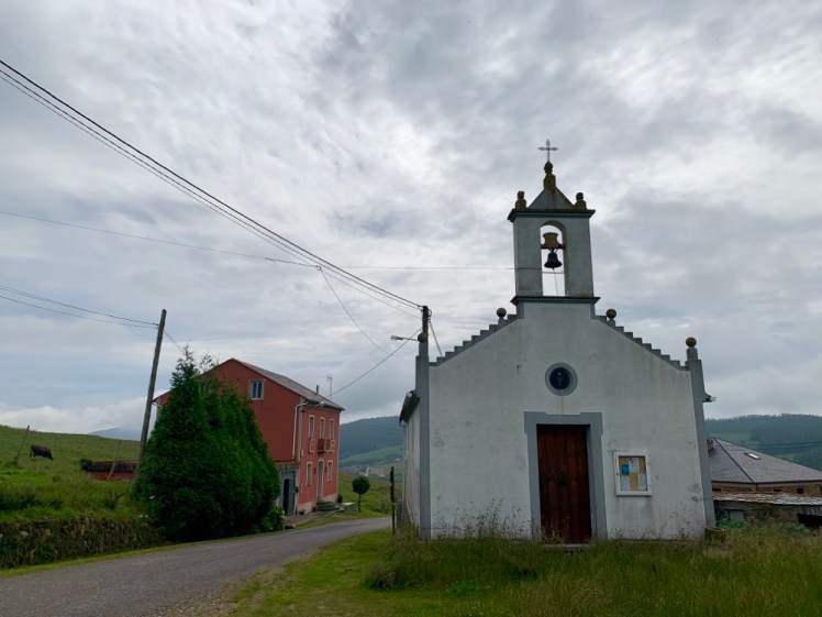 Usciamo dal bosco e a circa due chilometri dalla meta di oggi, Lourenzà, incontriamo la graziosa Capela de Santa Cruz, con il piccolo portico per dare rifugio ai pellegrini.