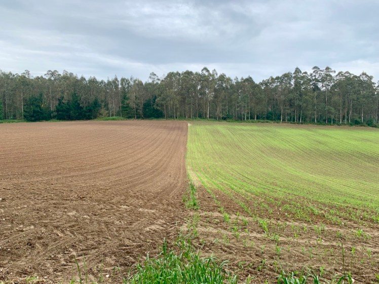 Entriamo in un’ampia radura coltivata. A sinistra, una fattoria abbandonata e sullo sfondo, le alture delle Asturie.