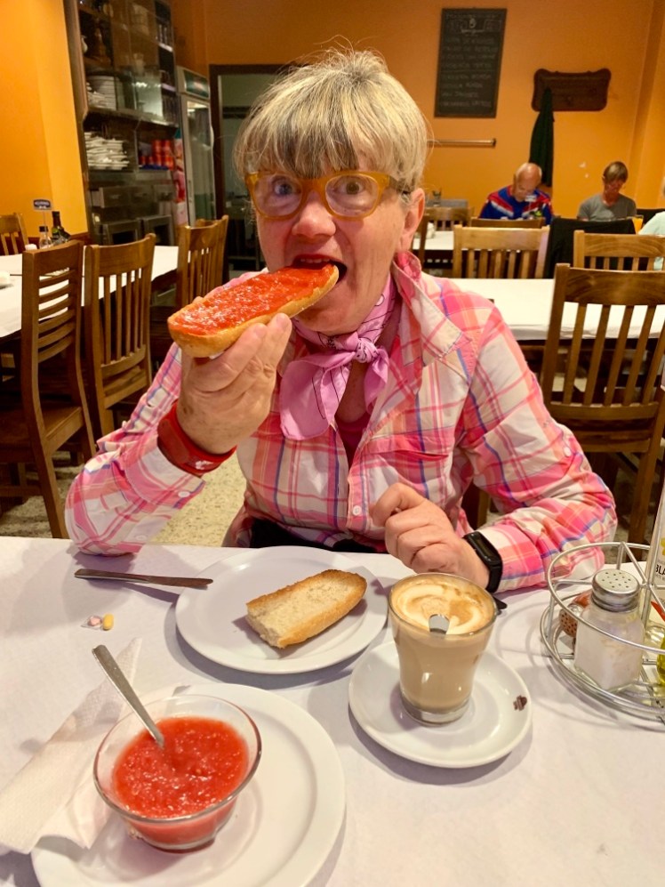 Facciamo un’eccellente colazione nell’albergo che ci ospita, con, tra l’altro, pan tostado/olio EVO/pomodoro fresco. Il mio sguardo la dice tutta…!