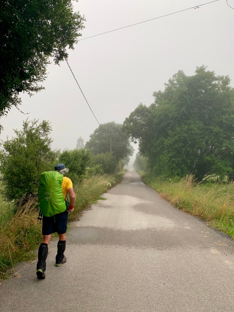 Il paese è avvolto nella nebbia, tutto tace. In giro, solo qualche pellegrino già avviatosi.